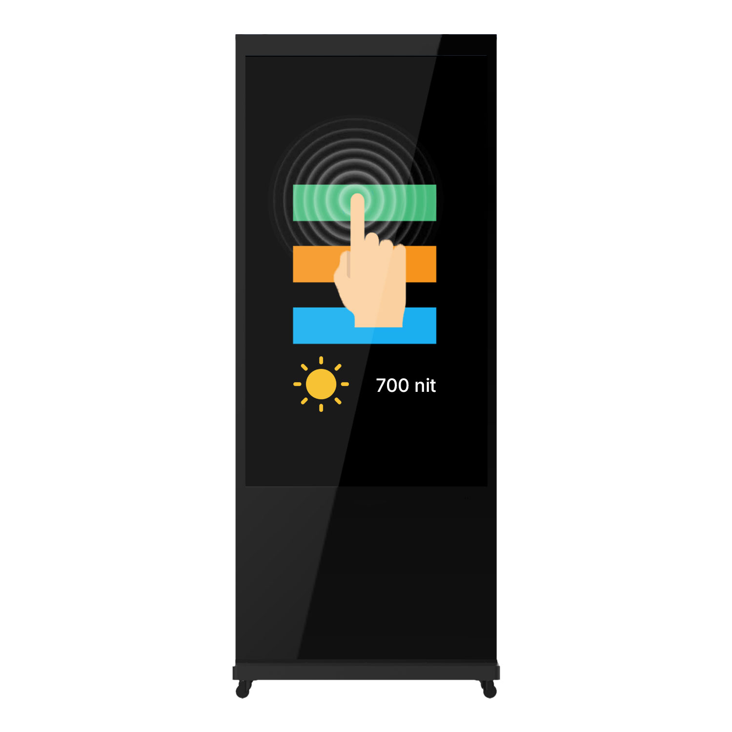 High-brightness, ultra-slim and interactive indoor multimedia totem. Minimalist design, glossy glass finish painted in black. Thanks to its wheels, it can be moved easily. It comes with a 3-year warranty and all Moai build quality.